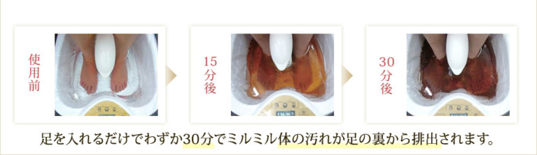 また、足を入れた水が時間の経過とともに、マイナス500~600mvレベルの、強い還元作用を持つアルカリマイナスイオン水(高濃度水素水)になることでも、体内の電位バランスが整えられどんどんデトックスが進みます。